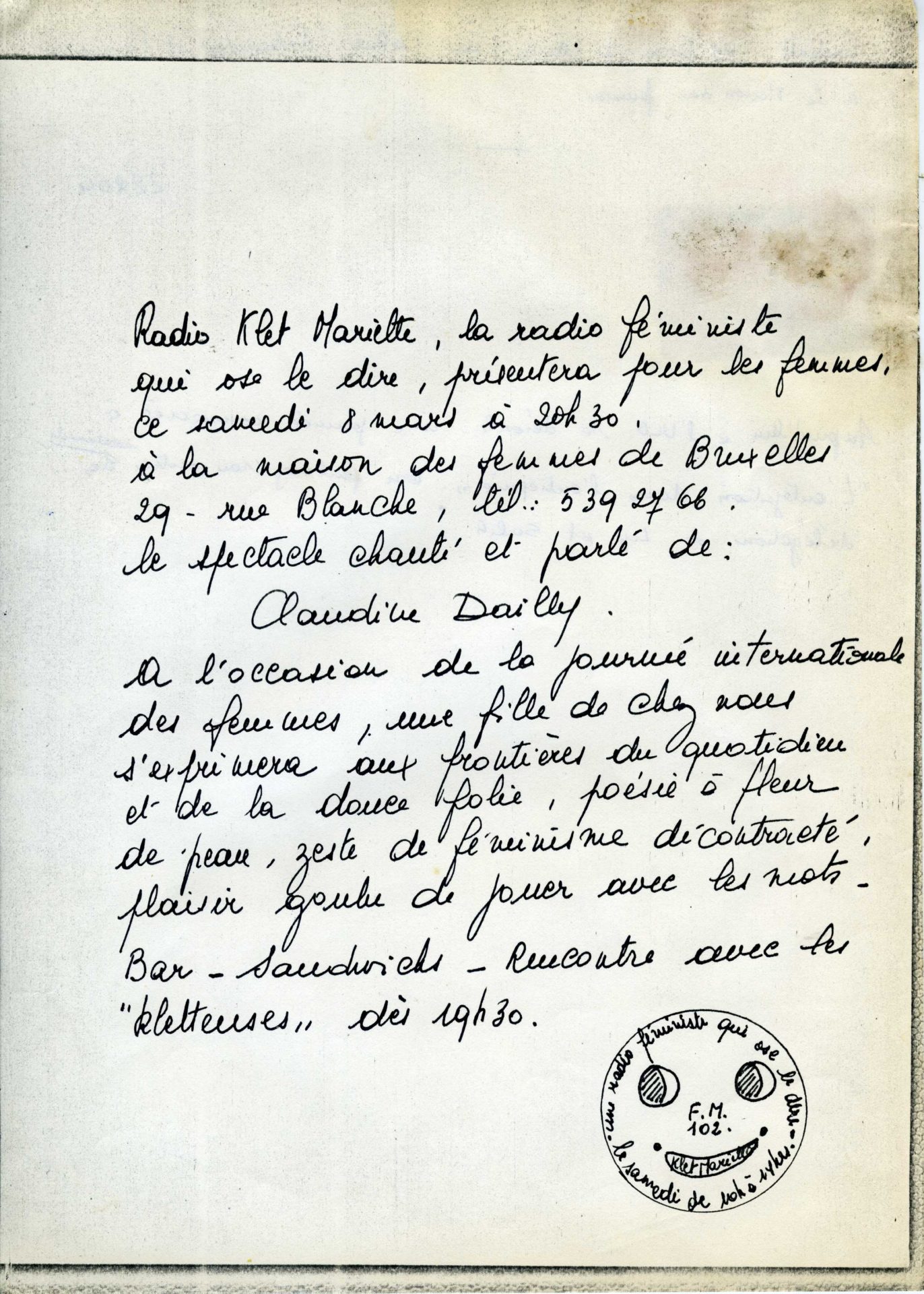 Nadine: We really liked the idea of challenging the state monopoly that was RTBF and broadcasting programmes illegally on the FM band. It was good, it was a bit of fun, I’d say. Because we were marginalised voices, we were minority voices. As a women’s movement, we weren’t well known, so free radio stations were a way for us to make ourselves known and to publicise our actions, our thoughts, etc. But also, since it was a radio, we played music, promoted female singers, composers, women’s bands, etc. We realised that everything that was broadcast on the radio was a certain representation of women and that all the feminist ideas that had emerged in the 1970s were not appearing in the mainstream media. So it was an attempt to intervene in the media landscape, I would say.